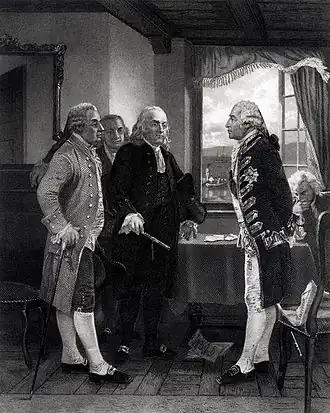 Lord Howe initially sought to meet with the men as private citizens since British policy did not recognize the Congress as a legitimate authority.[14] For the conference to take place, he agreed to the American demand to be recognized as official representatives of the Congress.[15][16]