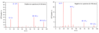 The mass spectrum of the secondary ions emitted from the bombarded surface during SSIMS provides direct information of not only the chemical composition but also of the chemical structure of the bombarded area. This is because the mass spectrum includes cluster ions as well as elemental ions. These cluster ions reflect the surface chemistry in a detailed way. The figure shows the mass spectrum obtained from a SSIMS analysis of polytetrafluoroethylene (PTFE). The positive ion spectrum shows positive atomic ions (i.e. C+) and molecular ions (i.e. CF+, CF3+, C3F3+) of the target. The negative ion spectrum shows negative atomic ions (i.e. F−) and molecular ions (i.e. F2−, CF3−, C3F3−).
