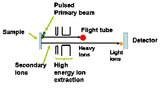 Ions are accelerated to a given potential so that they have the same kinetic energy, resulting in ions of different mass:charge (m/e) ratio having different velocities. These ions then pass through a region of field-free space in the flight tube, and spread out in time, with the higher-mass ions arriving later at the end of the flight tube, where a time-sensitive detection system produces a mass spectrum. The primary ions are pulsed into short bursts of less than 10 ns (the time scale of secondary-ion emission after impact is negligible (<10−12 s)). The primary beam is pulsed by a rapid deflection across a small aperture or by off-axis deflection, followed by a curved magnetic field to compress the pulse in space. There are very high accelerating fields at the sample (high extraction voltage and small (mm) extraction gaps) to reduce the initial energy spread of the secondary ions. Some TOF systems further compensate for this energy spread by using nonlinear flight tubes. One such design has a curved electrostatic path so that the more energetic ions are forced round the outer part of the bend. Another such design incorporates an electrostatic mirror in which the more energetic ions penetrate more deeply before reflection. In both designs, the faster ions have a longer flight path to offset their increased velocity, and all ions of the same mass arrive at the detector simultaneously.[6]