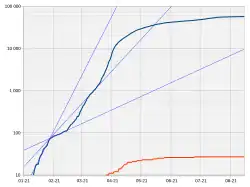 The linear plot shows the total number of cases as a function of time (by date) since 23 January 2020, the date of the first reported case in Singapore, while the graph plotted on a logarithmic scale, or a semi-log plot, shows an exponential growth in the number of cases as a straight line on the graph. In the logarithmic scale plot, the slope of the straight line determines the rate of growth of the number of cases, with a steeper slope representing a higher growth rate. The third and fourth plot shows the number of daily new cases and total active cases respectively as reported.