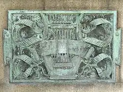 Gade is shown standing on a raised podium with a music stand. The conductor's score in front of him is open on a page from Elverskud, one of his most popular works, and the name of the works is inscribed on its rear side. On the pedestal is a relief featuring a lyre with the composer's name in capital relief lettering. A band on the bench is inscribed with some of Gade's most well-known works: " "OSSIAN", "SYMFONI I C Mol", "1817", "ELVERSKUD", "COMALA", "FORAARSFAN-TASIER", "KALANUS", "1890", "KORSFARERNE" and "PSYCHE"