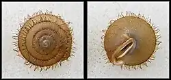 Fringed slitmouths have domed brown shells with 5+ whorls, dark blotches, and coarse hairs characteristic of the Stenotrema genus. The aperture is narrow with a defined, pale lip.