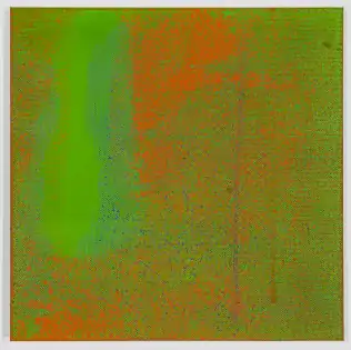 Maine's artworks are abstract, featuring edge-to-edge fields of irregular forms and optical effects deriving from color and layering.[8][28][29] They result from an unconventional painting technique that figures prominently in the artist's work and its critical reception. Whereas paint is typically applied by hand using a brush or palette knife, Maine applies it with makeshift stamps created by him from a variety of materials that have included carpeting, mesh, rope and distressed polystyrene foam.[30][31][32] The process produces crude reproductions subject to incidental effects and is akin to relief printmaking.[5][8] Commentators have asserted that by eliminating hand-controlled gesture from the painting process, Maine effectively subordinates personal expression to elements that are non-decisional, non-expressive and arbitrary.[8][5][21][33] He retains formal elements of artistic control, however, such as color palette and saturation, paint viscosity, and the pressure and repetition of paint impressions.[1][5][8]