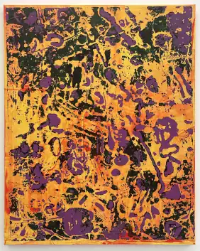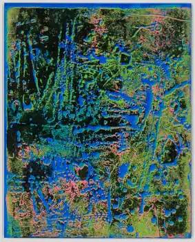 Since 2014, Maine's work has centered on the "Residue Paintings"—enveloping canvasses (some over 8' tall) of complex, all-over-style configurations of irregular drips, blobs and puddles.[24][1][8] For these works, Maine built a hinged construction that holds a large, flat plate made of plywood and polystyrene gouged and incised with fields of marks.[8][33] After applying a baseline layer of paint, he coats the plate in another color and stamps the entire canvas by pushing down or walking on the back of the plate, often making successive rounds of impressions using oppositional colors.[8][6] The process is intentionally imprecise, producing varied and unexpected effects.[1][6][24][34] Irregularities in coverage, pressure and alignment yield blends or transparent overlays of color, puckered and craquelure-patterned surfaces, and perceptual effects in which forms seem to hover, appear in relief or take on three-dimensionality (e.g., P17-0301, 2017).[8][6][21]