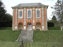 Two Palladian outbuildings serving as Orangery and "Library Room"[25] were built next to the house by John Rolle (1679–1730), MP, and the Library shows above the keystone of its central arch the arms of Rolle impaling the arms of the Walter Baronets of Sarsden, Oxfordshire, the family of his wife Isabella Walter (died 1734). Hoskins states that the manor house itself was rebuilt or remodelled sometime in the 18th century, Pevsner states c. 1709,[26] perhaps therefore at the same time as the building of the outbuildings. An engraving of this Georgian house survives, by James Bingley, published in 1831.
