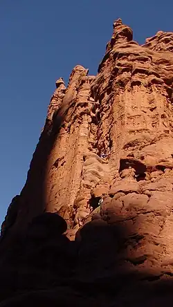 The Stolen Chimney is a traditional multi-pitch climbing route located on the Ancient Arts tower of one of the Fisher Towers. This is the most common routes used to ascend the "corkscrew" summit of the tower (the final fourth pitch). The corkscrew summit is the westernmost summit of the Ancient Art tower but it is not the tallest. The summit is noteworthy for its unusual shape which makes the climbing experience very different from most other climbs. The unusual shape is also visually striking. Photographs of the corkscrew summit have been extensively published in many settings including mainstream advertisements.[1][2][3]