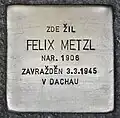HERE LIVED FELIX METZL BORN 1909 MURDERED 3.3.1945 IN DACHAU | Masarykovo nám. 96/I 49°00′15″N 14°46′17″E / 49.00425680000001°N 14.77129709999997°E | Felix Metzl was born in Třeboň on 13 April 1906 as a son of Emilie and Ludwig Metzl. He had five siblings and worked as a tradesman. On 18 April 1942 he was deported to Theresienstadt by Transport Akb, Nr. 751 from České Budějovice. From there, he was deported to Auschwitz on 1 October 1944 by Transport Emm, Nr. 254. He was murdered in Dachau concentration camp on 3 March 1945. | |