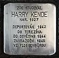 HERE STUDIED HARRY KENDE BORN 1927 DEPORTED 1942 TO THERESIENSTADT TO AUSCHWITZ 1944 MURDERED 1945 IN FLOSSENBÜRG | Česká 142/64 48°58′29″N 14°28′19″E / 48.9747034°N 14.471971199999984°E | Harry Kende was born on 24 March 1927 in České Budějovice. On the 18 April 1942 he was deported in the wake of Transport Akb, Nr. 222 from České Budějovice to Theresienstadt concentration camp. From there, he was deported to Auschwitz concentration camp on 28 September by transport EK, Nr. 586. Later on he was brought to Flossenbürg concentration camp where he was murdered on 8 March 1945. The stumbling block is located in front of his former school building. Moreover, Vilém Kende (1883–1944) who was most likely Harry Kende's Uncle and his wife Valerie Kendeová (1888–1944) were also murdered in Auschwitz.[1][2][3][4] Together with Harry Kende, on 18 April 1942, several family members were deported., i.e. with number 224 his father Vitezslav Kende, who was murdered in Auschwitz in 1944.[5] Vilém Kende (1883-1944), an uncle of Harry Kende, and his wife Valerie Kendeová (1888-1944) were also murdered in Auschwitz in 1944.[6][7] Their son Viktor, who was also deported with the transport Akb, has survived. In March 1942 Harry Kende's uncle Joseph was deported to Theresienstadt together with his wife Helena and the three sons Erich, Oto and Rudolf. He and his wife were murdered in Auschwitz, and son Erich died in Dachau. Son Oto survived the liberation of Mauthausen, but died shortly thereafter. Rudolf could survive and returned to České Budějovice.[8][9][10][11][12] |