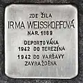 HERE LIVED IRMA WEISSKOPFOVÁ BORN 1889 DEPORTED 1942 TO THERESIENSTADT 1942 TO WARSAW MURDERED | Hejmanské hráze 11 48°57′33″N 14°56′00″E / 48.95928500000001°N 14.93334630000004°E | Irma Weisskopfovà was born on 20 October 1889. She was married to Karel Weisskopf, the couple had three children. On 18 April 1942 she and her husband were deported from České Budějovice to Theresienstadt concentration camp by transport AK/B, Nr. 820 and 821. Afterwards, on 26 April they were both transferred by transport An, Nr. 967 and 968, to Warsaw ghetto, where they were murdered.[13] |