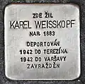 HERE LIVED KAREL WEISSKOPF BORN 1883 DEPORTED 1942 TO THERESIENSTADT 1942 TO WARSAW MURDERED | Hejmanské hráze 11 48°57′33″N 14°56′00″E / 48.95928500000001°N 14.93334630000004°E | Karel Weisskopf was born on 26 February 1883. He married Irma Weisskopfová, the couple had three children. They made a living with their own distillery which also included a pub. They were later driven out of their house and lost the distillery. On 18 April the married couple were deported from České Budějovice to Theresienstadt concentration camp. On 26 April 1942, Karel and his wife were brought to Warsaw ghetto where they were both murdered. | |