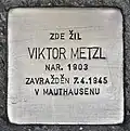HERE LIVED VIKTOR METZL BORN 1903 MURDERED 7.4.1945 IN MAUTHAUSEN | Masarykovo nám. 96/I 49°00′15″N 14°46′17″E / 49.00425680000001°N 14.77129709999997°E | Viktor Metzl was born on 13 January 1903 in Třeboň. He was a lawyer and he married Marie Vlasimska. The couple had two children – Alena (born in 1932) and Nora Metzl (born in 1934). On 4 October 1944 Victor was arrested, and he was murdered on 7 April 1945 in Mauthausen concentration camp. His wife was arrested in December 1944. When the war had finished, she returned home to her daughters. |