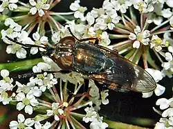 Adults are migratory and are present from July to October. They can usually be found feeding on nectar and pollen of umbellifer flowers (Apiaceae) and of Asteraceae species (mainly Scorzoneroides autumnalis, Tanacetum vulgare, Anthriscus sylvestris, Erysimum cheiranthoides, Filipendula ulmaria).[4][5]
