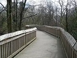 Opened in 2003, the walkway is raised above the ground and follows a 90 metres (300 ft) route through the woodland's lower canopy. This allows a closer view of the mature oak trees, as well as lakes and ponds below. it also features interpretation boards and children's poems and art carved in to the rails.