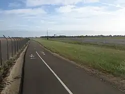 The bikeway crosses roads at-level near each of the five expressway exits. At two of these junctions, the bikeway crosses two roads — At Two Wells Road it also crosses Wingate Road which provides a local road crossing of the Gawler River and at Womma Road, the bikeway also crosses the north-south Heaslip Road. Several of the minor roads that were cut to create the Max Fatchen Expressway have a pedestrian and bike gate in the fence to provide access to the shared path from roads that do not have direct access to the expressway.