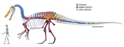 The holotype, MNN GDF500, was found in the Tegama Beds of the Elrhaz Formation. It consists of a partial skeleton, lacking the skull. It contains three neck ribs, parts of fourteen dorsal (back) vertebrae, ten dorsal ribs, gastralia (or "belly ribs"), pieces of three sacral vertebrae, parts of twelve caudal (tail) vertebrae, chevrons (bones that form the underside of the tail), a scapula (shoulder blade), a coracoid, a partial forelimb, most of the pelvis (hip bone), and parts of a hindlimb. The spinal column was largely articulated; the remainder consisted of disarticulated bones. Parts of the skeleton had been exposed on the desert surface and had suffered erosion damage. Additionally, several specimens have been assigned as paratypes: MNN GDF 501 to 508 include a snout, a quadrate from the back of the skull, three dentaries (tooth-bearing bones of the lower jaw), an axis (second neck vertebra), a rear cervical vertebra, and a rear dorsal vertebra. MNN GDF 510 to MNN GDF 511 comprise two caudal vertebrae. All of the original Suchomimus fossils are housed in the palaeontological collection of the Musée National du Niger.[1] The initial description of Suchomimus was preliminary. In 2007, the furcula (wishbone)—found during an expedition in 2000—was described in detail.[2]