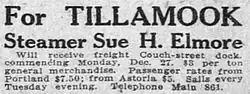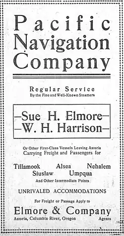 In 1904, the Pacific Navigation Company provided steamship service, using Sue H. Elmore, W.H. Harrison, or "other first-class vessels", to Tillamook, Alsea, Nehalem, Siuslaw, Umpqua and other intermediate points on the Oregon coast.[23] The company advertised its steamers as providing "unrivaled accommodations."[23]