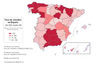 According to WHO's 2016 suicide report, Spain ranked 130th of the 170 countries listed.[1] Spain had an overall suicide rate of 6.1 per 100,000 people, less than most other countries in Europe (e.g. Sweden 11.7/100.000; France 12.3/100.000; Germany 9.1/100.000; UK 7.6/100.000) The reason behind this is unknown; among the many reasons put forward it has been argued that Southern European Mediterranean countries are less prone to suicide for cultural reasons, such as ease of socialisation, deeper religious beliefs that consider suicide as a sin, or just favourable weather conditions rendering less likely seasonal depression. This is consistent with the fact that other southern European countries such as Italy, Greece or Portugal, share a similar low suicidal rate as compared with northern countries. However, exceptions exist since Hungary, a relatively southern country, ranks high in suicidal rates (13.6/100.000, see ref above).