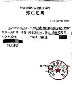 - ^ ""胖猫"事件反转 重庆警方指死者姐姐操控舆论引导网暴" ["Fat Cat" incident reversal: Chongqing police point to the deceased's sister manipulating public opinion to incite online violence.]. Lianhe Zaobao (in Simplified Chinese). 20 May 2024. Archived from the original on 3 June 2024. Retrieved 2 August 2024.