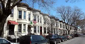 Though many row house districts in New York City housed wealthy professionals and businesspeople, Sunset Park was developed as a middle-class area, with most residents being either mid-level professionals (such as clerks and bookkeepers) or skilled tradespeople, including carpenters and plumbers.[78][79][80][81] At the time, row houses were falling out of favor with the upper class, which had started gravitating toward detached single-family homes in more suburban areas, notably exemplified by the garden city movement and the Prospect Park South and Ditmas Park developments in nearby Flatbush. With many examples clad in brownstone (a style that had largely become old-fashioned by the late 1890s) to evoke the grandeur of earlier neighborhoods, the row houses in Sunset Park were a viable option for middle-class families who could not afford to move to the suburbs or into single-family houses.[50] The Brooklyn Daily Eagle wrote that "the general tendency seems to be to develop Greater South Brooklyn in such a way that families possessed of moderate incomes may there establish themselves...under conditions which will not put too heavy a strain on the purse".[21][50] For the majority of two-family row houses in Sunset Park, which were speculatively developed for no specific tenants, the owner's family lived in one unit and rented the other out.[50] Many row houses were extremely crowded, often housing ten or more people across both units.[82] Other residences in Sunset Park were single units or apartment buildings.[83]