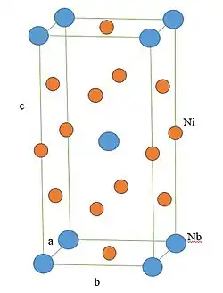 - Gamma double prime (γ"): This phase typically is Ni3Nb or Ni3V and is used to strengthen Ni-based superalloys at lower temperatures (<650 °C) relative to γ'. The crystal structure of γ" is body-centered tetragonal (BCT), and the phase precipitates as 60 nm by 10 nm discs with the (001) planes in γ" parallel to the {001} family in γ. These anisotropic discs form as a result of lattice mismatch between the BCT precipitate and the FCC matrix. This lattice mismatch leads to high coherency strains which, together with order hardening, are the primary strengthening mechanisms. The γ" phase is unstable above approximately 650 °C.[13]