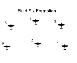 One tactical innovation adopted by 2nd TAF Spitfires was the "Fluid Six"' formation, which had been developed through combat experience in Europe and North Africa. The first use of the tactic dated back to at least November 1941. It is known that No. 112 Squadron RAF used this in the North African campaign.[99] This formation "was considered the best fighter formation of the war".[100] It abandoned the leader-wingman combination that had existed before. Instead, it was based on three pairs of Spitfires which could provide mutual cover and support: the pairs were 'stacked' in altitude so that the pair (e.g.: 5 & 6) flying up-sun, and covering the tails of the leaders (1 & 2), flew higher, while the other pair (e.g.: 3 & 4) flew lower. Any attacking aircraft could be sandwiched between two pairs of Spitfires, no matter the direction or altitude of the attack. Another advantage of this formation was that when operating at squadron strength a flight commander was able to lead six aircraft of his own flight, "whereas, with formations of four there would more likely be one formation from each flight with the third consisting of aircraft from another flight."[100]