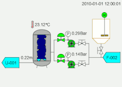 - The HMI is the operator window of the supervisory system. It presents plant information to the operating personnel graphically in the form of mimic diagrams, which are a schematic representation of the plant being controlled, and alarm and event logging pages. The HMI is linked to the SCADA supervisory computer to provide live data to drive the mimic diagrams, alarm displays and trending graphs. In many installations the HMI is the graphical user interface for the operator, collects all data from external devices, creates reports, performs alarming, sends notifications, etc. Mimic diagrams consist of line graphics and schematic symbols to represent process elements, or may consist of digital photographs of the process equipment overlain with animated symbols. Supervisory operation of the plant is by means of the HMI, with operators issuing commands using mouse pointers, keyboards and touch screens. For example, a symbol of a pump can show the operator that the pump is running, and a flow meter symbol can show how much fluid it is pumping through the pipe. The operator can switch the pump off from the mimic by a mouse click or screen touch. The HMI will show the flow rate of the fluid in the pipe decrease in real time. The HMI package for a SCADA system typically includes a drawing program that the operators or system maintenance personnel use to change the way these points are represented in the interface. These representations can be as simple as an on-screen traffic light, which represents the state of an actual traffic light in the field, or as complex as a multi-projector display representing the position of all of the elevators in a skyscraper or all of the trains on a railway. A historian is a software service within the HMI which accumulates time-stamped data, events, and alarms in a database which can be queried or used to populate graphic trends in the HMI. The historian is a client that requests data from a data acquisition server.[2]