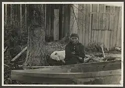 One village was located at the head of Liberty Bay, near what is today Poulsbo.[28][21][33][34] This village had one shed-roof house in which several families lived. The area was good for salmon fishing and deer hunting, as well as gathering mushrooms.[34] Snyder, who recorded place names in 1952, also noted that a Suquamish family had lived in the past at dəxʷp̓əc̓p̓əc̓əb (lit. 'place of diarrhea'), east of what is today Lemolo. The people in this village were called sqaqabixʷ, 'many people'.[34] A fort was located south of this spot at Keyport Lagoon (hudčupali, 'firewood place'), built to defend against raids from tribes to the north.[34]