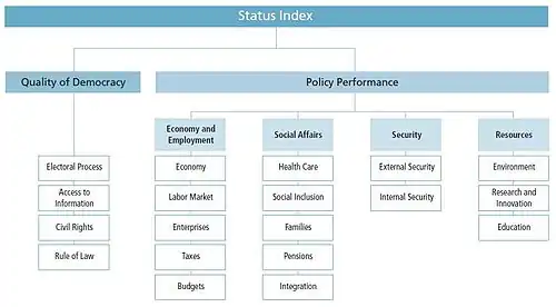 - The first dimension of the Status Index maps the quality of democracy within a country and examines four criteria: "Electoral Process," "Access to Information," "Civil Rights," and "Rule of Law."