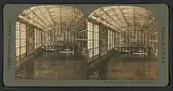 - Sutro Baths (1894–1964), a massive public bath house and freshwater swimming facility. It included six saltwater swimming tanks of varying sizes, shapes, and water temperatures, tiers of bleacher-like seats, providing seating for thousands of spectators, and a massive arched glass roof made from 100,000 square feet of stained glass and supported by 600 tons of iron girders.[2][6]