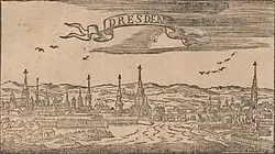 On 8 September, Charles XII marched past Görlitz to Markersdorf, towards Dresden. He went through Reichenbach to Kubschütz the following day.[52] On 11 September, he bypassed Bautzen to Bischofswerda, where Augustus' Privy councillor Imhoff and Privy referendary Pfingsten arrived from Dresden to negotiate.[61] Charles XII left negotiations to his ministers, Carl Piper and Olof Hermelin, and marched past Stolpen to Radeberg on 12 September. The next day, he sent Johan August Meijerfeldt southeast of Dresden, to Sonnenstein Castle at Pirna, while he bypassed Dresden to the north,[62][63] now heading for Leipzig with its 1,600-man garrison.[1] He arrived at Weinböhla on 14 September and crossed the Elbe river at Meissen the following day.[62] The garrisons in Leipzig and Wittenberg evacuated,[64] as the Saxon ministry commended Schulenburg to retreat with the army.[34] On 17 September, Charles XII marched through Lommatzsch, Mügeln, over the Mulde river, to Grimma, where he received reports that Schulenburg's army was nearby.[64] It consisted of 2,800 infantry,[65] including 1,200 Russians,[59] and 1,800 cavalry.[65]