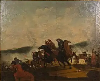 Upon realising the direction of the invading Swedes, Schulenburg ordered major general Jordan into Upper Lusatia to observe their movements and to overwhelm Charles XII and his vanguard if possible.[52] His force consisted of Fürstenberg's and his own dragoon regiments,[c] totalling 600–700 men.[52][54] Against them, Charles XII sent Colonel Görtz, who had previously been in Saxon service, with 250 men of the Life Dragoon Regiment and the Scanian Estate Dragoons,[52] as well as 50 Wallachians.[d][54] At the dawn of 7 September,[e] Görtz found Jordan in an advantageous position behind a river,[52] near Rosenhain and Radmeritz (between Löbau and Reichenbach).[f][58]