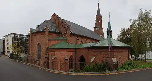 Tønsberg Cathedral (Norwegian: Tønsberg domkirke) is a cathedral that is the episcopal seat of the Diocese of Tunsberg within the Church of Norway. It is located in the centre of the city of Tønsberg in Tønsberg Municipality in Vestfold county, Norway. It is the main church for the "Tønsberg domkirke" parish which is part of the Tønsberg domprosti (deanery) in the Diocese of Tunsberg. The brown brick church was built in a long church design in 18 using plans drawn up by the architect . The church seats about 500 people.[1][2][3]