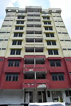 Located on Lot 1301, Section 95, Jalan Thamby Abdullah, Kuala Lumpur.[11] The high-rise, is in Kuala Lumpur's Brickfields neighborhood. Like the architect's other apartment house, Blue Boy Mansion, the 9 Storey Flat features a roof terrace. It was built in 1965 by Architect T.Y. Lee and Sons.[12] In 2015, the once prestigious modern flat house lay abandoned.