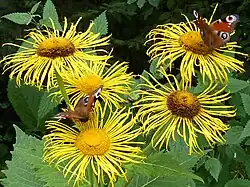 The flowers of Telekia speciosa are used by a large variety of pollinating insects including various species of bee, butterfly and hoverfly.[18] Butterflies such as the European peacock (Aglais io), the common swallowtail (Papilio machaon), the green-veined white (Pieris napi) and the high brown fritillary (Argynnis adippe) have been recorded to feed from the flower of T. speciosa.[19] Bee species such as the bumblebee (Bombus semenoviellus)[20] also pollinate the flowers of T. speciosa.