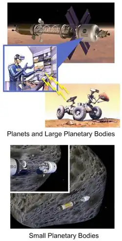 NASA has proposed use of highly capable telerobotic systems[9] for future planetary exploration using human exploration from orbit. In a concept for Mars Exploration proposed by Landis, a precursor mission to Mars could be done in which the human vehicle brings a crew to Mars, but remains in orbit rather than landing on the surface, while a highly capable remote robot is operated in real time on the surface.[10] Such a system would go beyond the simple long time delay robotics and move to a regime of virtual telepresence on the planet. One study of this concept, the Human Exploration using Real-time Robotic Operations (HERRO) concept, suggested that such a mission could be used to explore a wide variety of planetary destinations.[7]