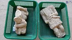 The 6 meter diameter Umm Al Nar tomb with two internal chambers and a removal flat stone doorway, located 10 meters west of the tower and made of limestone ashlar blocks and beach stone, contained the mostly dis-articulated co-mingled remains of some 410 individuals (276 adult).[6][7] Analysis of the human remains have shown evidence that individuals suffering illness and limited mobility were cared for, pointing to a developed society which was sufficiently secure and prosperous to be able to afford compassion.[7] One of the individuals, a woman in her twenties, was found to be suffering from polio, thought to be the earliest dated instance of the disease in human history.[8] Grave goods found included "ceramic and stone vessels, copper and bronze rings, spearheads, ostrich eggshell fragments, beads, and infant feeding shells". The tomb dated to the late 3rd millennium (2200-2000 BC). The subadults included a number of pre-term infants, neonates, and infants under two years of age.[9][10] Charcoal samples in the tomb were radiocarbon dated to 2197-2036 B.C, calibrated with CALIB 3.0.3c.[11]