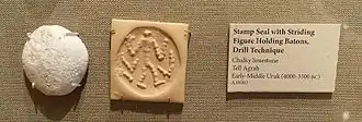 The primary excavation effort was on the large Early Dynastic temple consisting of a main sanctuary with altar and offering table and two smaller subsidiary sanctuaries on the same plan The temple was believed by the excavators to be dedicated to Shara based on a stone bowl fragment inscription "To Shara has Anunu, foreman of (yeo)men, presented (this) as a gift.". However, subsequent research suggests that it may have belonged to a local deity, Iluma'tim, while the name dLAGABxIGI-gunû from the bowl fragment, formerly read as Shara, might instead be Išḫara, which according to Gianni Marchesi and Nicolo Marchetti is more plausible in the light of the distribution of cult centers of these two deities.[5] Only the western end of the temple was studied, the rest being badly eroded. The temple was about 60 metres (200 ft) square and was surrounded by a wall 6 metres (20 ft) wide with large supporting buttresses. The presence of sling stones and a sappers tunnel indicated an attack in the Early Dynastic era. Aside from a number of treasure caches, cylinder seals,[6] and a sculptured mace-head of gypsum ornamented with lions' head found, the most notable find was a copper chariot pulled by four onagers, one of the earliest examples known.[7][8] Three cuneiform tablets in Old Akkadian were also found[9] as well as "two small bronze statuettes of men and one of a woman (all with inlaid eyes of mother of pearl)" as well as tools and weapons made of bronze and the remains of a copper statue that would have originally been 4/5 life size.[10] A metal hoard consisting of "silver wires, rings/coils, ornaments, beads and an enigmatic ‘gold weight'" was found in a long corridor and dated to Early Dynastic II.[11] A single neolithic clay token was also found.[12][13] A notable find was a green steatite vase, elaborately engraved.[14]