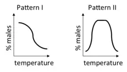 Pattern II has two transition zones, with males dominating at intermediate temperatures and females dominating at both extremes.[14] Pattern II occurs in some turtles, lizards, and crocodilians.[16] Mixed sex ratios and (more rarely) intersex individuals have been observed at or near the pivotal temperature of sex determination.[15]
