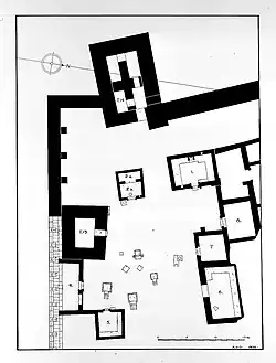 The temple itself was a large, open air space, measuring 38 metres by 34 metres. The temple is nestled in the southwest corner of Dura, with the city wall forming its walls. Within the courtyard are eight rooms--nine if tower 14 is counted--and eight scattered altars. Just as in the Temple of Bel, there is no residual evidence of fire on the altars, so they were probably used just for incense and libations. The general building plan of a courtyard with rooms inside is typical of Durene temples, but the irregularity of their placement in the Temple of Aphlad is unusual. Susan Downey noted that the temple is also odd because it lacks a temenos wall. Another unique feature is the incorporation of towers into religious space. It is unknown whether tower 14 was a part of the sanctuary, but another, heavier tower, was built inside the wall in the Roman period, with its door opening directly into the courtyard.[2] Von Gerkan proposed a theory that the temples of Bel and Aphlad "were placed so as to put the two most vulnerable corners of the city wall under divine protection."[2] A few of the altars, as well as the two holiest rooms, faced east. One of these is the sanctuary of Aphlad (room 1); the other room was divided in into two (rooms 2a and 2b), a forecourt (pronaos; 2b) and sanctuary proper (naos, 2a). The interior of this room was decorated with frescoes. A bowl was built into the floor at the doorway of room 2b, which could be used for ritual purifications. The sanctuary of Aphlad "had benches on three sides, an altar with an incense dish, and, on one of the walls, a somewhat basic painting of a cult-scene depicting a large bird on an altar."[3] Greek graffiti was found on its walls. A block with an inscription was found face down in the sanctuary, placed beside the cult relief, with an inscription reading: