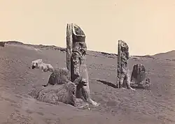 The second larger temple which was built at el-Sebua was known as "The Temple of Ri'amesse-meryamun [Ramesses II] in the Domain of Amun" and constructed roughly 150 m northeast of Amenhotep III's temple.[5] Contemporary monuments and representations of the viceroy of Kush, Setau, indicate that this temple was set up between Years 35 and Year 50 of Ramesses II.[5] Setau is known to have served as the Viceroy of Kush or Nubia between Year 38 to 63 of this pharaoh's reign and was responsible for Ramesses' later Nubian temples.[6] The temple of Wadi es-Sebua was the third sanctuary or chapel constructed from rock with a forecourt built with stones that Ramesses II erected in Nubia. Located at approximately a hundred and fifty kilometers south of Aswan, on the western bank of the Nile, the temple owed its importance to the fact that during the Ramesside period, the city was built at the outlet of the caravan roads, was used as the place of residence for the viceroy of Kush and because it was located at a difficult stretch of the Nile which was difficult for boats to traverse up against the current. Ramesses II entrusted the management of his work projects here to the viceroy of Nubia Setau which, if one judges by the poor quality of the Osiride style and statues of the court, was forced to settle on an "untrained work force, many of whom were snatched from the Libyan oases" and by "inferior raw materials."[7]