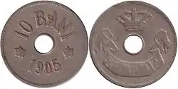The third ten-bani coin entered circulation in 1905 and also saw issue the following year. Although the same diameter and composition, it weighed 0.5g less (4g) due to a hole through the centre. On the obverse, the crown was placed above the hole and the name of the country was written on a scroll underneath. The reverse featured the denomination at the top, a rose on each side of the middle and the year at the bottom. The coins were designed by Anton Scharff, chief engraver at the Austrian Mint in Vienna. The 10.82 million coins of 1905 were minted exclusively at Brussels while in 1906 17 million from Hamburg, Germany supplemented 24.18 million from Brussels. The Hamburg-struck coins feature a 'J' mintmark below the scroll on the obverse while those of Brussels are without a mintmark.[3]