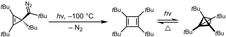 Heating tetra-tert-butyltetrahedrane gives tetra-tert-butylcyclobutadiene. The reversibility of this rearrangement proved key to developing a more scalable synthesis. In the last step, photolysis of a cyclopropenyl-substituted diazomethane affords the desired product through a tetrakis(tert-butyl)cyclobutadiene intermediate:[4][12]