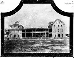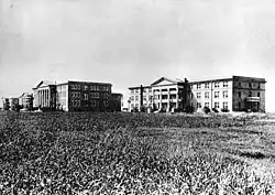 The TCU campus in Fort Worth in 1910–11 consisted of four buildings: Clark Hall and Goode Hall, the men's dormitories; Jarvis Hall, the women's dormitory; and the Main Administration building (now Reed Hall).