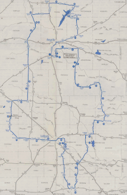 The roughly 580 mile highway route looped across 23 counties in the Texas Panhandle and South Plains. The trail generally avoided major interstate highways, instead focusing on lesser-used roads and byways that revolved around the major population centers of Amarillo and Lubbock. Promotional maps published in 1968 highlighted 41 historic and cultural sites ranging from Palo Duro Canyon State Park, the Muleshoe National Wildlife Refuge, the Levelland and Slaughter Oil Fields, and other local industry and commerce sites. The trail also noted agricultural products such as feed lots, cotton fields, and native grass ranchland.[3]