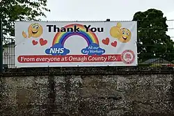Large numbers of private individuals placed home-made signs in their windows and outside their homes to thank the NHS workers.[1][2][3] The handmade posters frequently featured drawings of rainbows.[4]