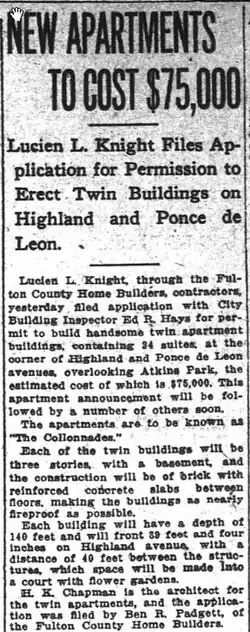 - ^ "New apartments to cost $75,000: Lucien L. Knight files application for permission to erect twin buildings on Highland and Ponce de Leon", Atlanta Constitution, February 12, 1916