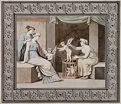 Even so, Charles VII was interested in researching and cataloguing the antiquities and so commissioned a comprehensive catalogue of them in 1759. Only completed in 1792, stretching to eight volumes with several illustrations and only published in a very small edition intended as exclusive gifts for a small circle of buyers in European courts, it was entitled Le antichità di Ercolano esposte (The Antiquity of Herculaneum Exhibited). The Cupid Seller appeared in volume 3, which was published in 1762.[1] It was shown in a copperplate engraving by Giovanni Elia Morghen after a drawing by Carlo Nolli, reproducing the fresco almost exactly, and the text interpreted it as a scene of goddesses.