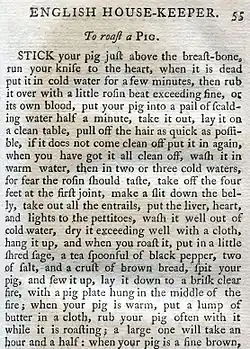 Raffald is however not afraid to use foreign words for new techniques, as "to fricassee Lamb Stones",[8] "to barbecue a Pig",[9] "Bouillie Beef",[10] "Ducks a-la-mode",[11] "To fricando Pigeons",[12][b] "To ragoo Mushrooms".[13][c] In explanation of this, she writes in the Preface to the First Edition: