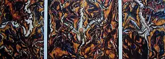 The Floating Shadows is a triptych made by Nabil Kanso in 1986 on the brutality and suffering inflicted during the Lebanese Civil War.[1] The painting is oil on canvas and measures 2.75 x 7.60 meters (9 X 25 feet).[2] It forms part of the Cluster Paintings series that Kanso began in 1986 and marks the transition to a new approach in his compositional framework.[3] The pictorial layout divides the canvas space into various sections reflecting a cluster of interlinked planes depicting floating figures of predominantly dark-blue set against deep orange ground and demarcated by white grayish areas.[4]