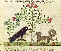 An Eastern story of flattery rewarded exists in the Buddhist scriptures as the Jambhu-Khadaka-Jataka.[9] In this, a jackal praises the crow's voice as it is feeding in a rose-apple tree. The crow replies that it requires nobility to discover the same in others and shakes down some fruit for the jackal to share.